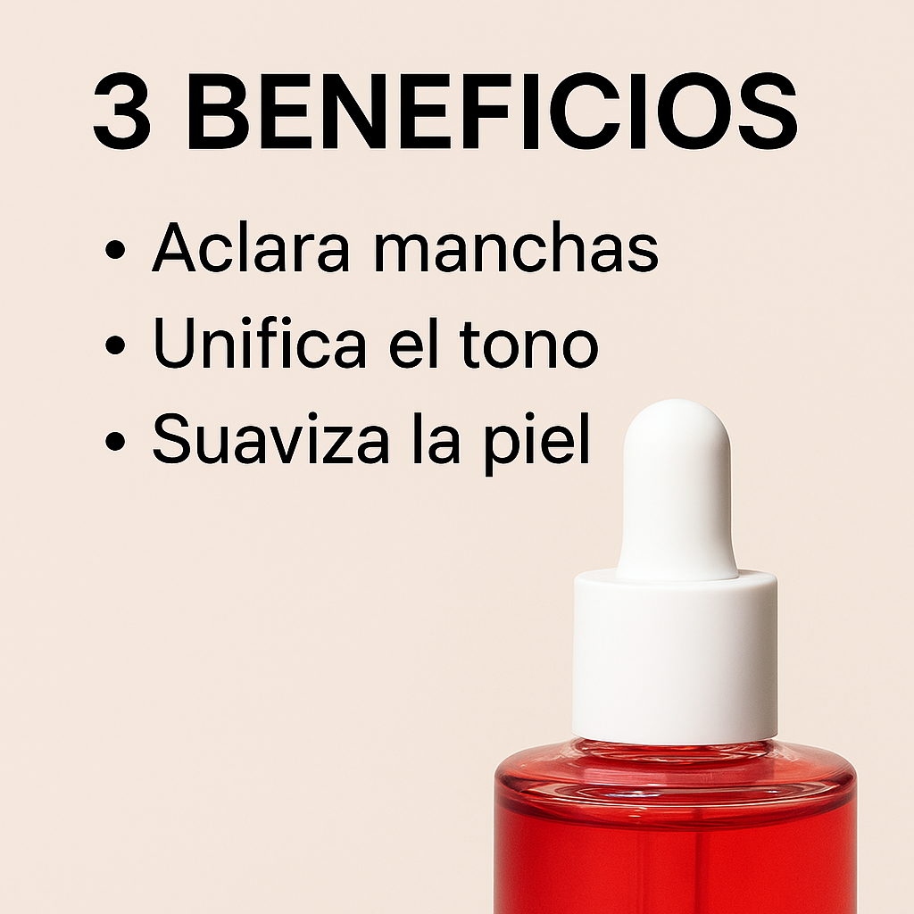 Inhibe la transferencia de melanina, ayudando a aclarar manchas. Mejora la textura de la piel y minimiza poros visibles y suaviza la superficie.